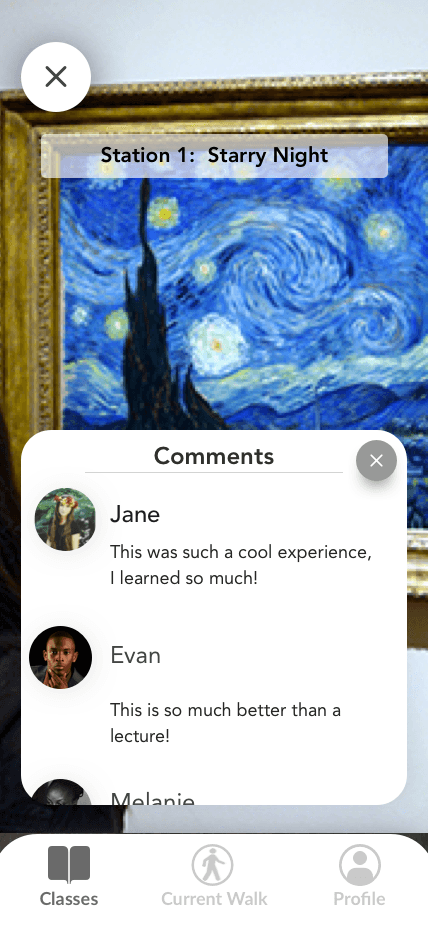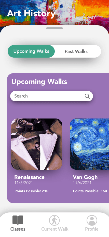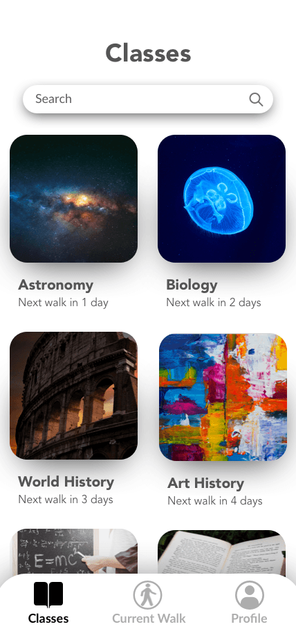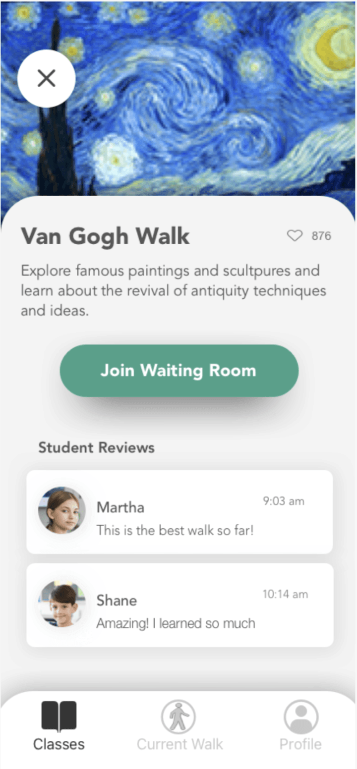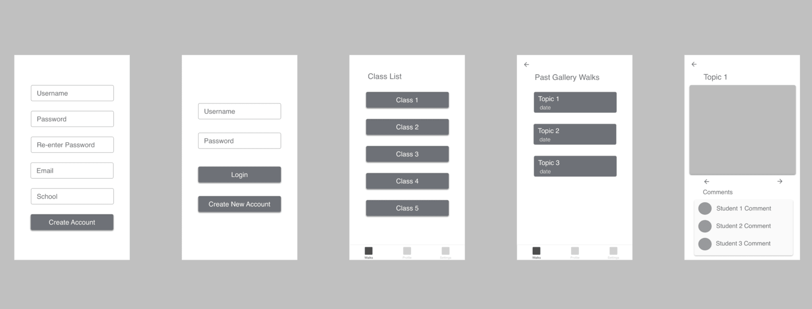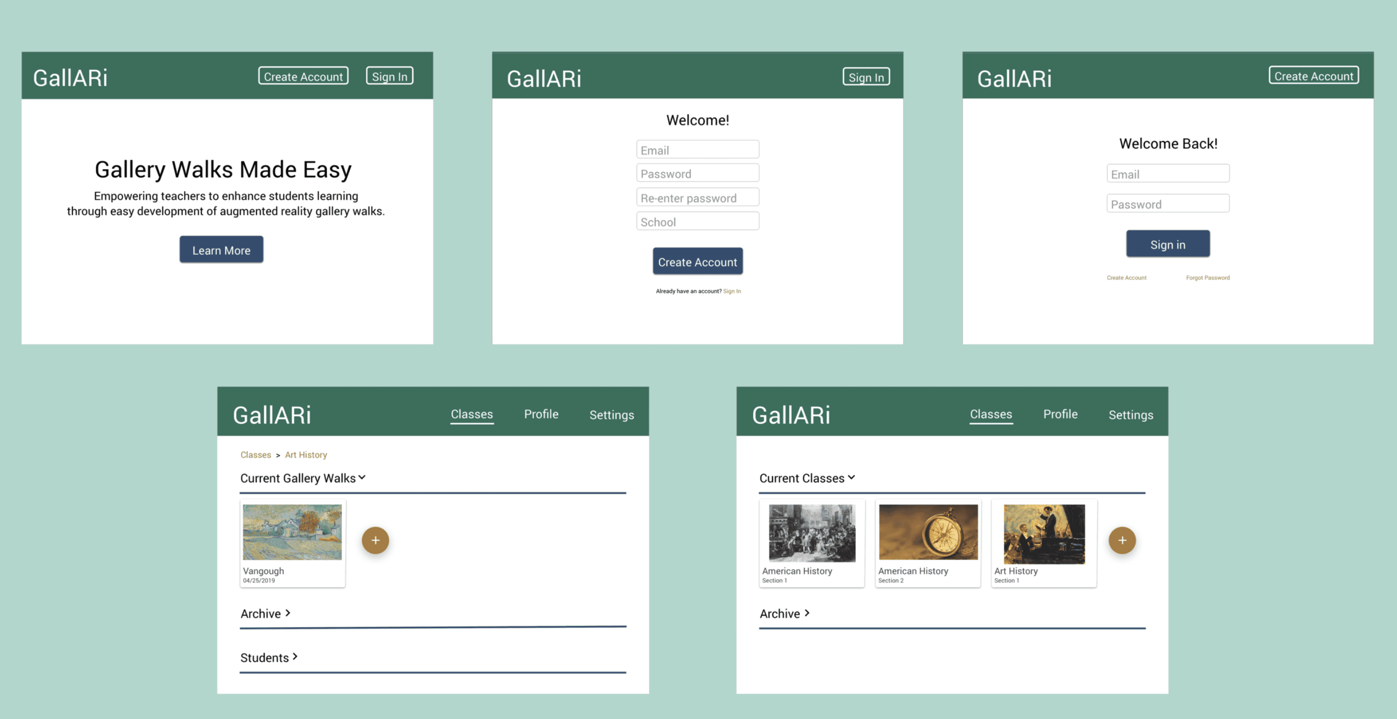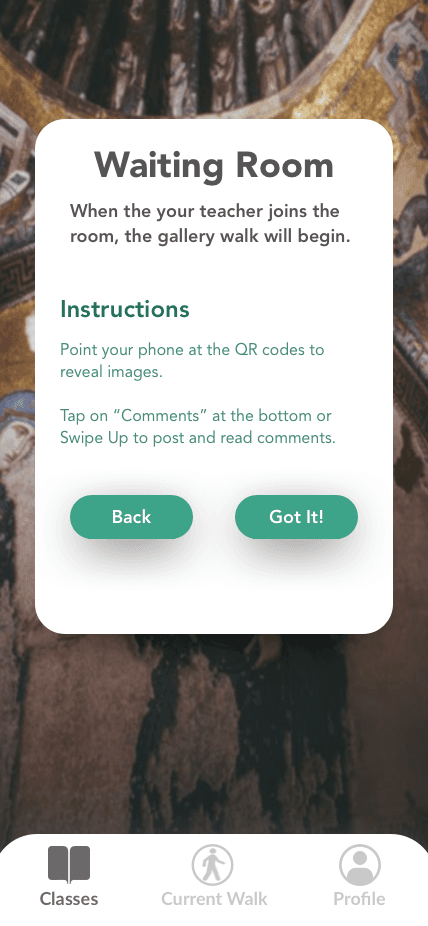 We created wireframes for both mobile (for students) and desktop (for teachers). The desktop web app allows teachers to find/print content and create/schedule lesson plans, while the mobile app is the student’s tool for viewing gallery walks. After designing the wireframes, we prototyped them with InVision so that we could conduct usability testing.
